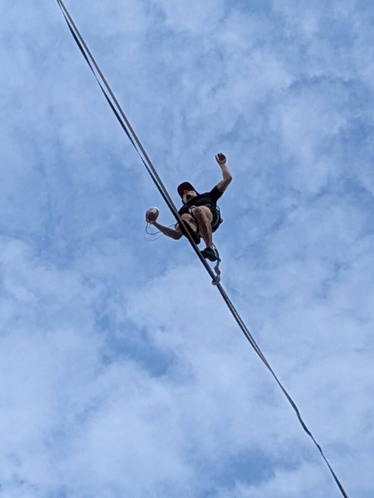 Direkt im Herzen der Stadt spannte Friedi eine spektakuläre Highline – und balancierte scheinbar mühelos über die Köpfe der Zuschauer hinweg. Mit seinem unverwechselbaren Stil, beeindruckender Körperkontrolle und viel Charisma begeisterte er nicht nur Slackline-Fans, sondern auch Neulinge und Passanten, die zufällig vorbeikamen.