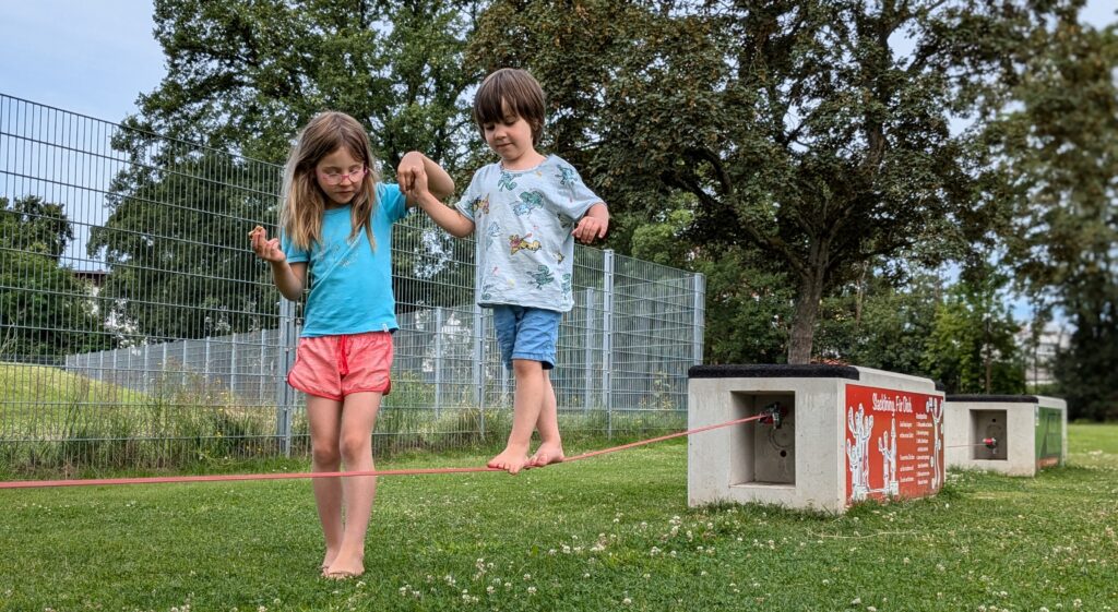 - Kinder lernen miteinander zu slacklinen, indem sie sich an den Händen halten.